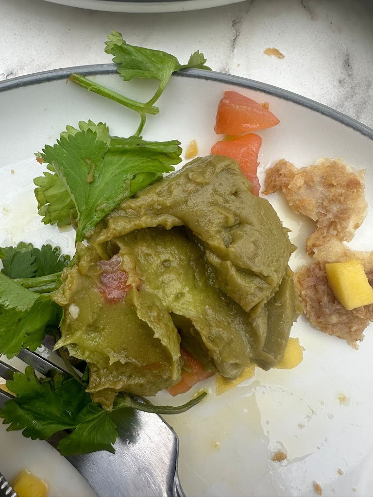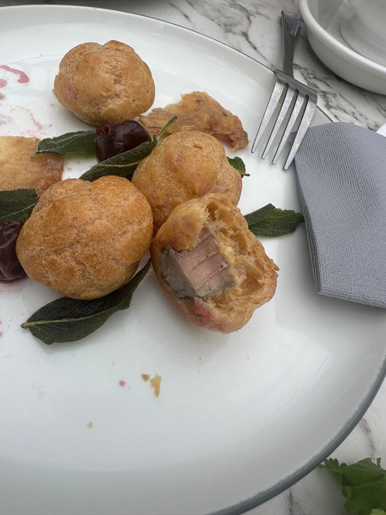I had a really bad experience with my lunch. The chicken liver profiteroles were rotten, grey-colored, and smelled bad. I only took a small bite, fortunately, because it looked spoiled, and it was decorated with fried chicken skin (what?!) which was extremely unappetizing. The cured salmon, avocado, and mango tartare was also terrible. The smoked (it should be mentioned on the menu, but it was not) salmon was randomly cut, not in cubes at all and smashed avocado seemed like it was prepared a couple of days ago. Soup was okay, I'll give you that one. Overall, it looked like the kitchen staff was off that day and was replaced by random people passing by.