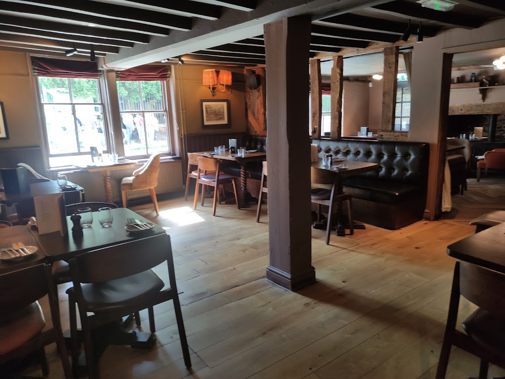 Owned by Greene King and labeling itself as a gastro pub, its more expensive than youd like for. Apub and the menu is mainly seafood with some meat options. The scallop starter for 9 pounds has a serving of 4 small scallops, the burger is basic bread, lettuce cheese, and the fries were mostly just deep fried batter. But what upset me most was the prawn cocktail which consists of one large prawn - head, shitsack and all, which requires some more peeling than you would want for 11 quid. The atmosphere is aimed to be fancy but the food just didnt reflect it. The price did.