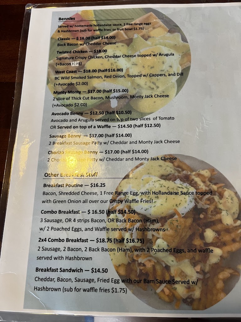 Wow! Absolutely amazing food! I live and brunch in Victoria so this was a great surprise in Campbell River. And unsweeted waffle fresh with bennies awesome idea! Dinner feel but food is comfy and modern twist. Took the Monty Monty, was starving but had a boxed left over.. .fruit sub for hash well priced. Soft bennies were perfectly soft handmade/ no molded rpubd weird shape. Waffle amazing Iced coffee reasonable price, was on the sweet side but they kindly added more coffee and it balanced it. Plus you can get bubble tea in the morning rather than night!! Got a peach-mojito black tea with pearls. Amazing food and staff , they were busy kind but not overwhelmed ! I will be back! Parking: Strip mall with a lot of parking. Wheelchair accessibility: A lot of space between tables ; kids menu, enough spaces between table..