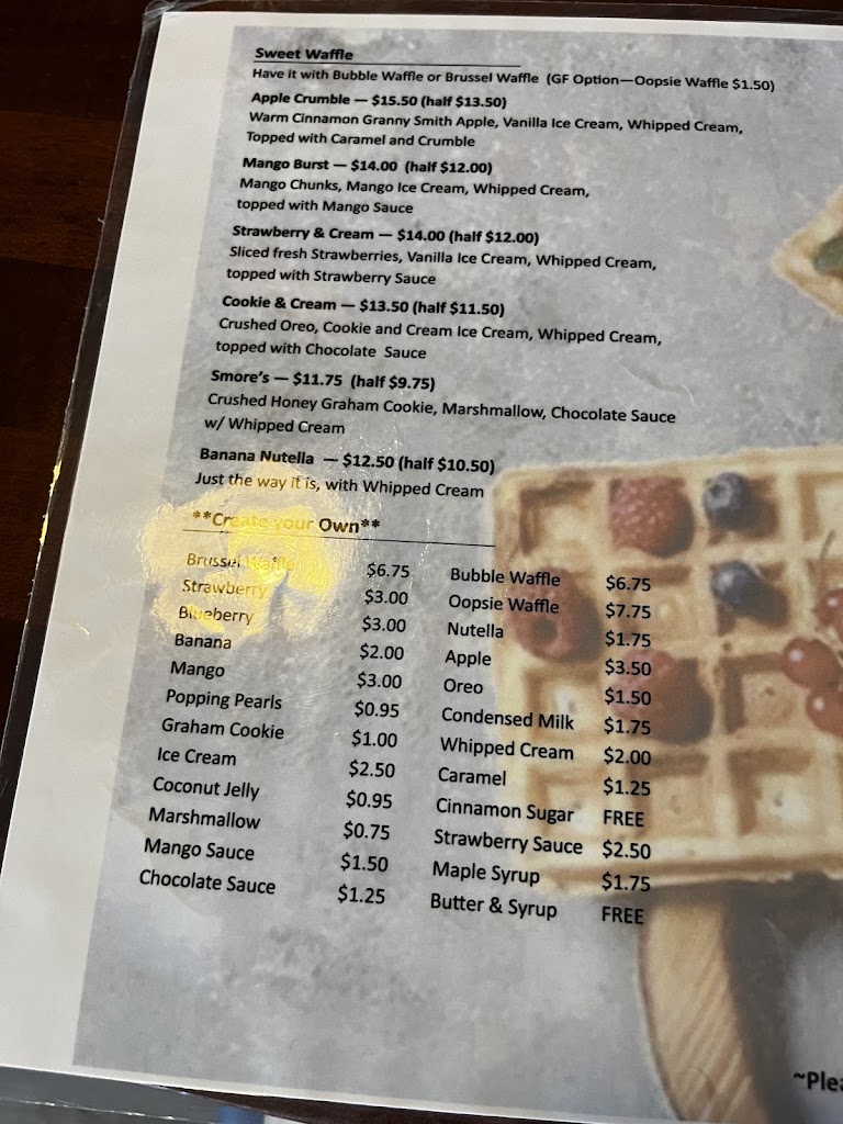 Went for the first time this past weekend around lunch time. Super nice and friendly staff, delicious waffles and bubble tea! i had the 1/2 size mango burst on a bubble waffle and a green tea lychee mojito with lychee jelly bubble tea Deff will be back to try the others!