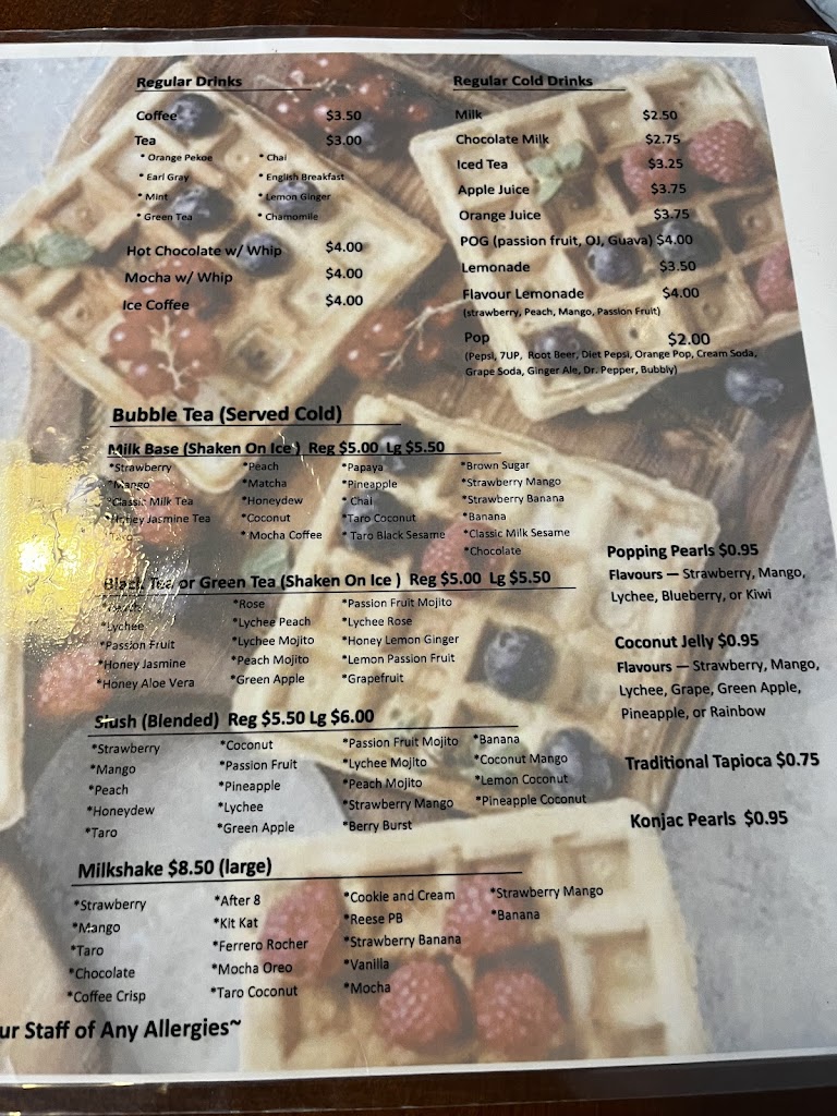 Delicious food and friendly staff. All of the waffles are amazing and the bubble tea is a nice treat too. One of our go to breakfast places! Very affordable compared to most other places too.