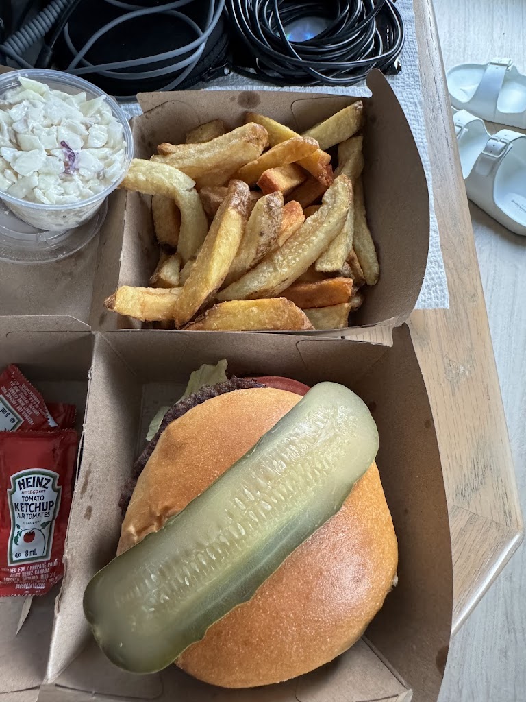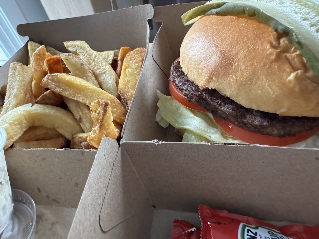 The fries were overdone and soggy, like they had been reheated and the beef patty in the burger also tasted like it had been overcooked. Courtenay Whitespot food is much better.