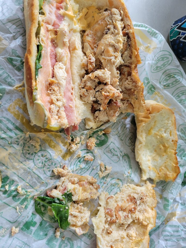 My husband ordered me a footlong chicken and bacon ranch sub to go. When we returned to our air bnb I took a couple of bites and realized the bread is soggy. This is my first time having this experience. Also the bacon was chewy. I believe it's the chicken itself that's soggy.