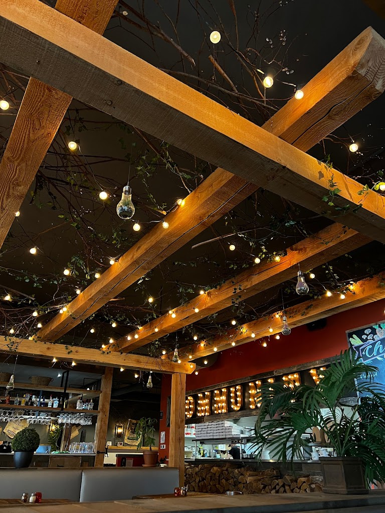 A very warm and inviting restaurant with a wood fire pizza oven and open concept bar. Everything is accented in rustic wood framing, beams, and tables. The large patio nestled out front of the restaurant is built out of large timbers and boards, incorporating the old trees as a natural canopy. Glass garage doors open directly to the patio during warm months. The food is very good! Try the Caesar salad and the 420 pizza.