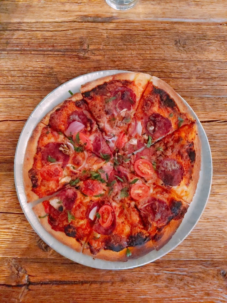 Delicious flatbreads cooked on stone slabs in their wood fire oven. We shared a 13 half Farmers, half Hot & Spicy. The ingredients were fresh and came together nicely. The flatbread was thin and baked to perfection. We also shared a large Caesar salad, which was slightly overdressed but tasty nonetheless. The ambiance is nice and cozy.