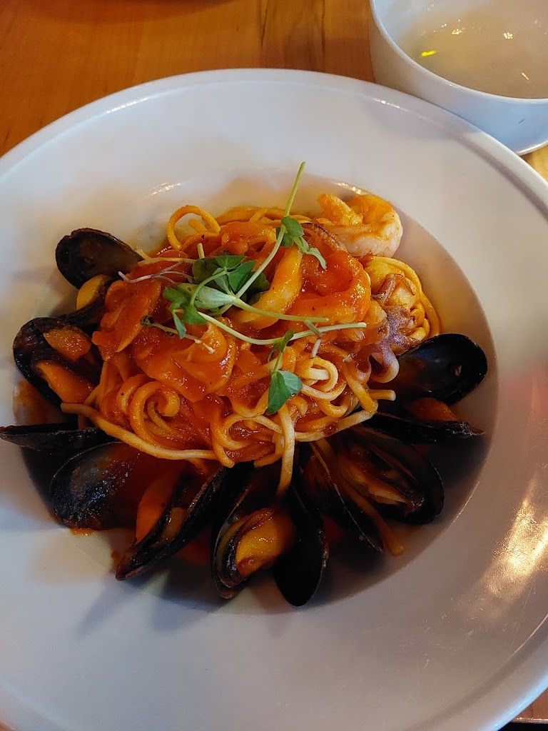 Very delicious seafood pasta and bruschetta! Lots of seafood in the pasta and such great service !