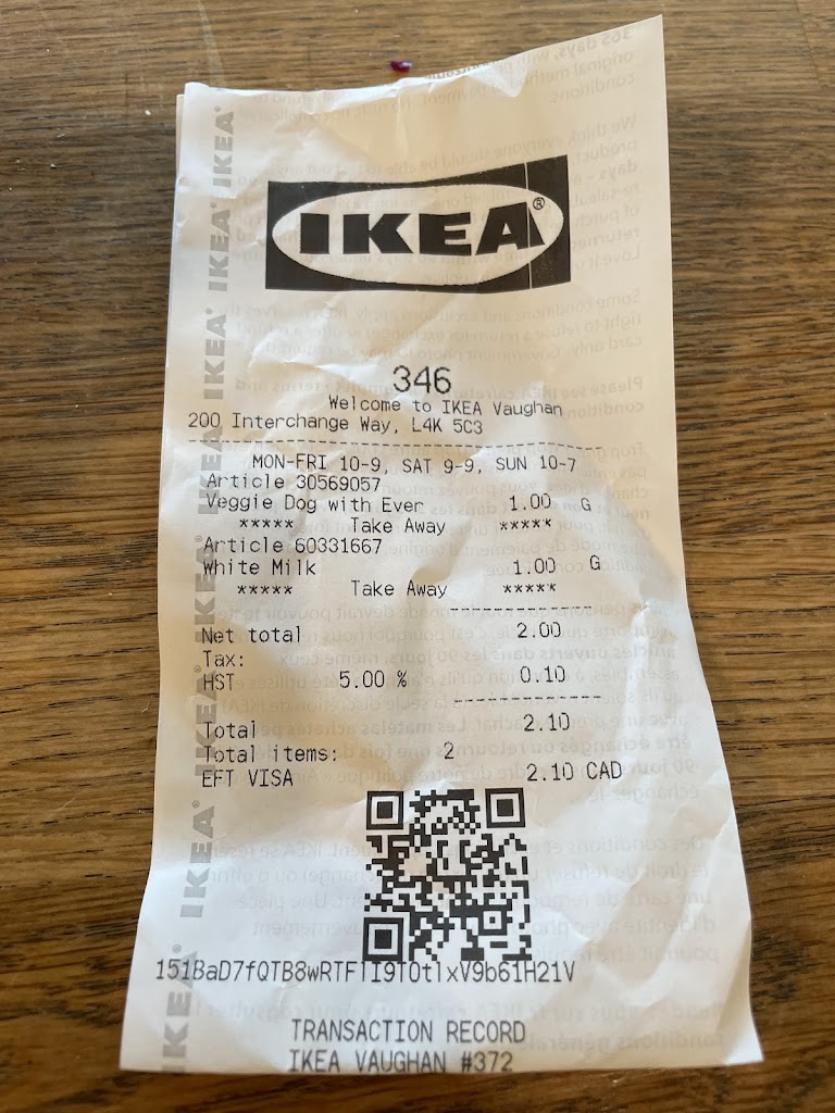 The last time I touched food at IKEA!!! On Nov 8, 2023 around 7PM my wife and I decided to have dinner at IKEA Vaughan before looking for a bed frame. We bought veggie balls, meatballs, samosa and a cake. I took the first bite into a samosa and just as I started to chew a looong dark hair wrapped around my tongue. Not mine, not my wifes for sure! A couple hours later some bloating and flavors...came as well. The food used to be ok, but not anymore. I for one will not touch their food again!