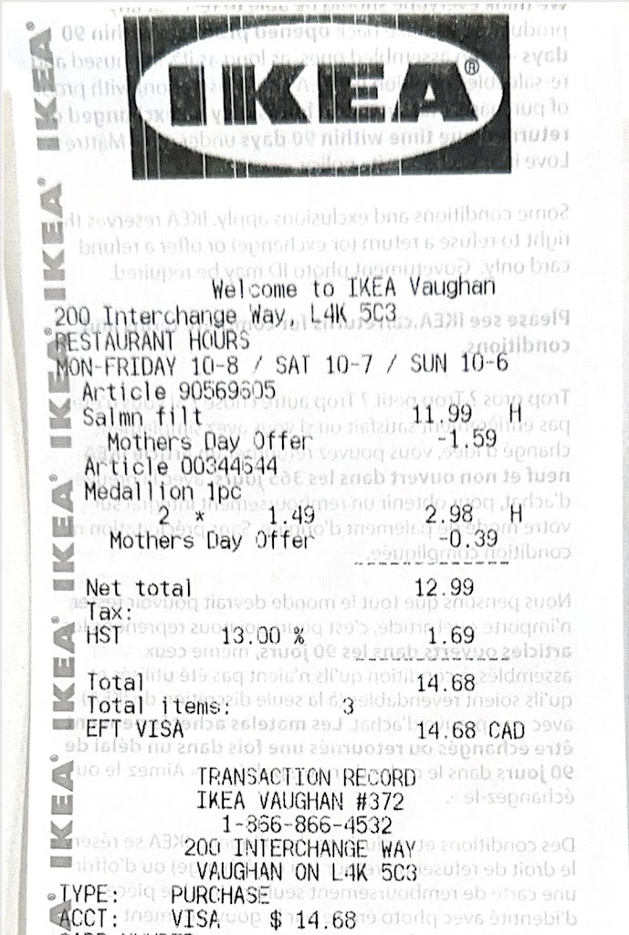 Bought the fish and chips in Ikea on a Thursday May 16 at 15:15.. The lady asked me for my IKEA card (what I never got, just the number) so I told her I dont have the card..after checking my receipt I realized she charged me full price instead 50% of promotional on thursday.. went to talk to her to tell her she asked me for the card but I have the numbers as ikea never sent me card by mail.. I was told as the transaction was done, she couldnt do anything for me. She asked me if she I want to talk to the manager (white bold guy) who was nothing helpful in any way and giving me non sense examples... anyways, the employees dont advise you about anything the store is offering even though you good deal in what you just buying.. I lost around $30 ($5 discount on the food and $25 coupon - BOTH I was not advised about by the ikea employee Vaughan at food Restarant on May 16 at 15:15).