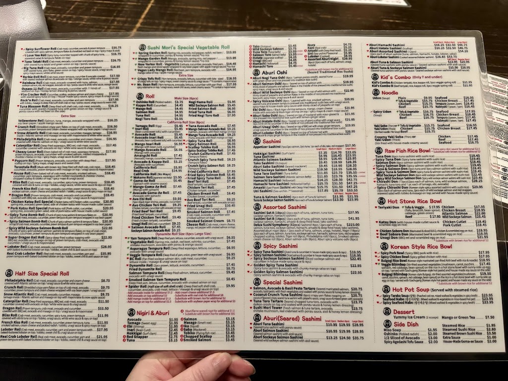 We had a lovely dinner at Sushi Mori. The rolls are quite big and everyone left feeling full. The atmosphere is lovely and would be nice for a romantic dinner, but three kids will take the romance out of any restaurant experience. Staff were friendly and prompt. Huge menu.