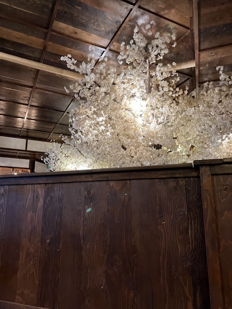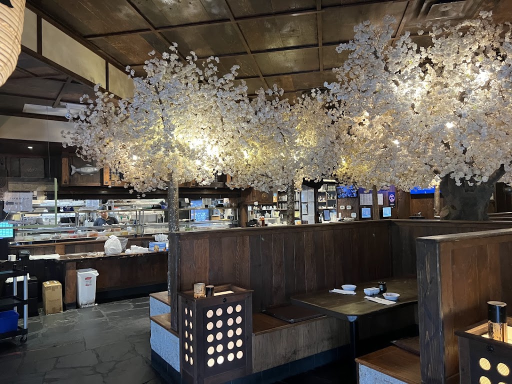 Amazing cherry blossom trees with perfectly matched background music Foods are like art and yum. I highly recommend volcano rolls. Also so kind staff especially Manager Jake was so kind and welcoming.