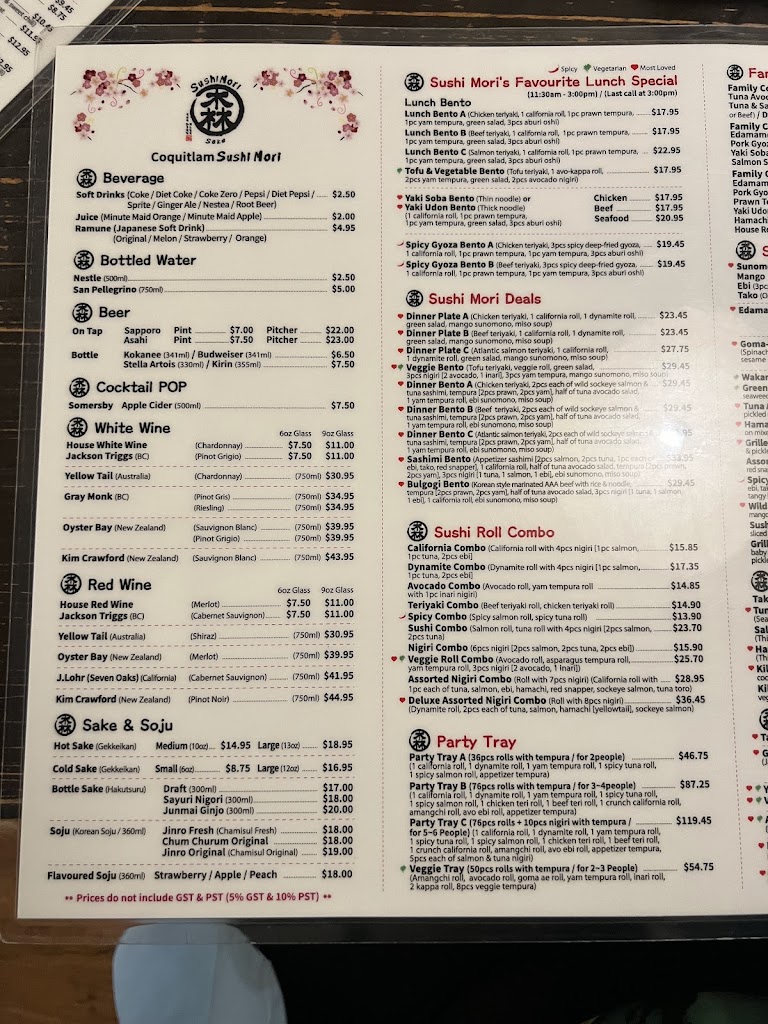 I have been going to Sushi Mori at Port Moody for over 15 years. Their food is always consistent and delicious! Parking: Plenty of parking at the parking lot. Kid-friendliness: They have kid s meal on the menu.
