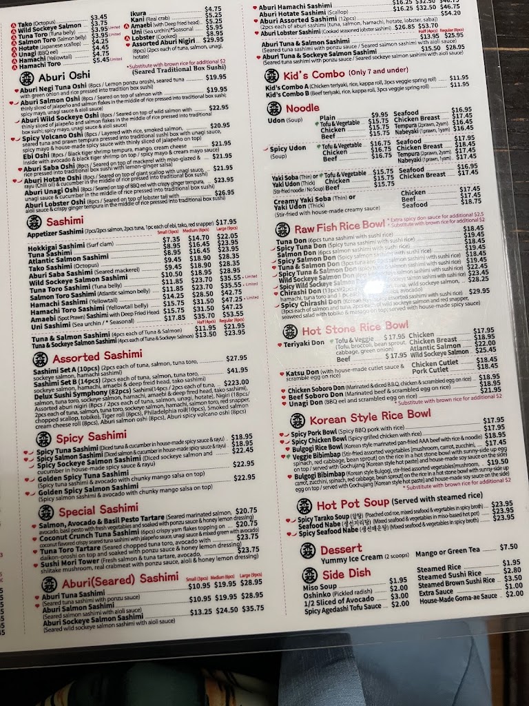 Went here at around 830pm on a weekend. We got 3 rolls to share as a snack. The sushi rolls were expensive (average $20/roll) and taste is pretty average. Not bad, but not that great. We ordered 2 aburi rolls, which had jalapeno slices on them (normal), but the seeds were not removed, making them very spicy. The dynamite roll had lettuce in it which felt very much like a filler. Service felt slow even though it wasnt busy at that time. If youre indecisive, the menu will overwhelm you, but on the flip side, theyll probably have something for everyone.