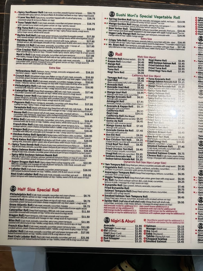 Sushi Mori is my favorite place to eat in or take out. The service is one of the best. The staff are so friendly and welcoming. I would highly reccomend Sushi Mori. Thank you for making our experience one of a kind each time we come in. Dietary restrictions: They offer soybean paper
