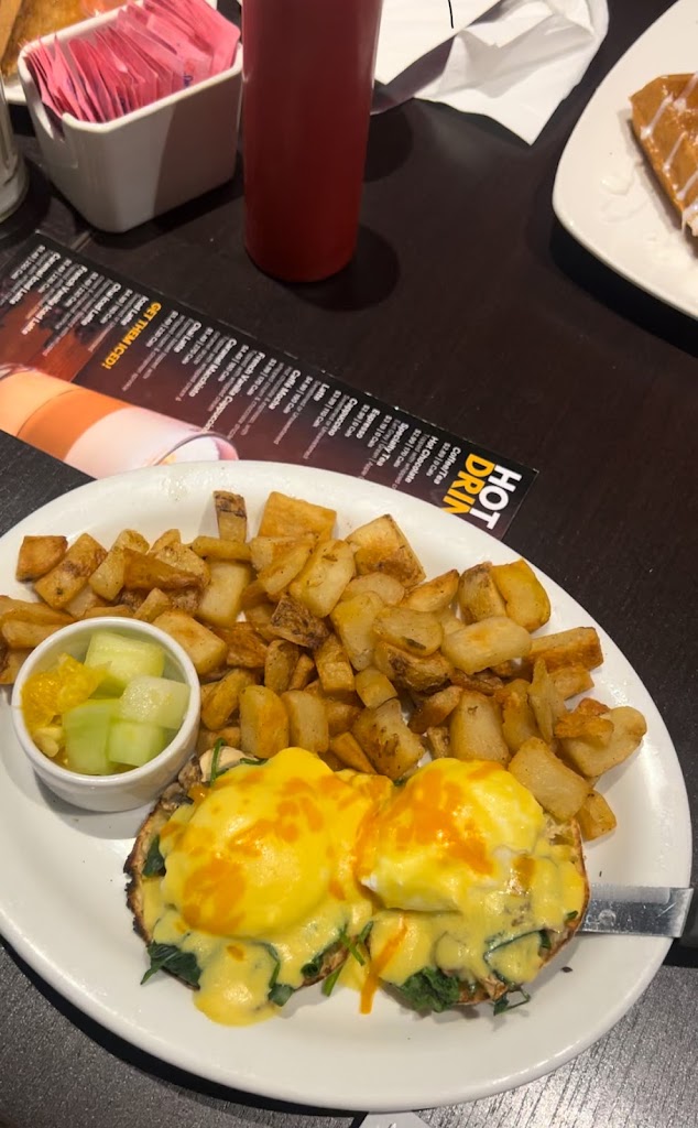 Spinach and mushroom eggs benedict were great. One thing that was weird is that they don’t poach the egg instead it’s fried and they ask you if you want it “soft medium or hard”.The food was good and the service was quick. Parking available.