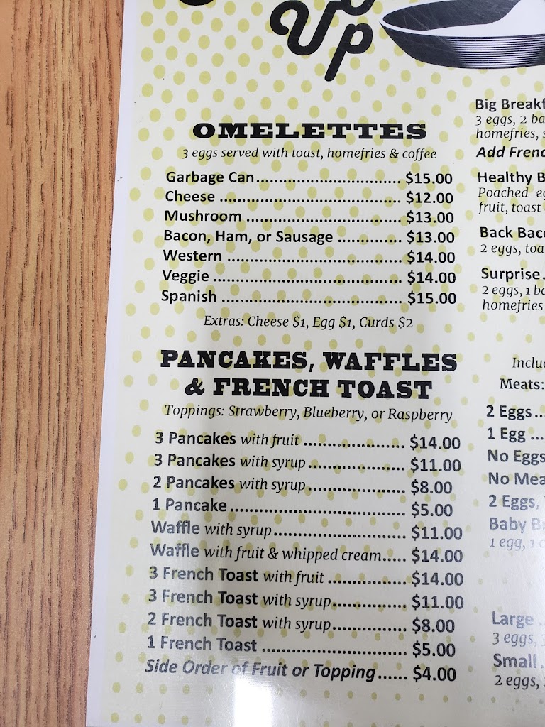 I spent 68 dollars on three breakfasts (two omelettes and a three egg three meat meal) and one of them came out incorrect. After waiting 10-15 minutes for a waitress to come and ask if there was anything to no avail, I finally got up and went to the cash myself. For the price that is poor service, and the price does not justify the meal.