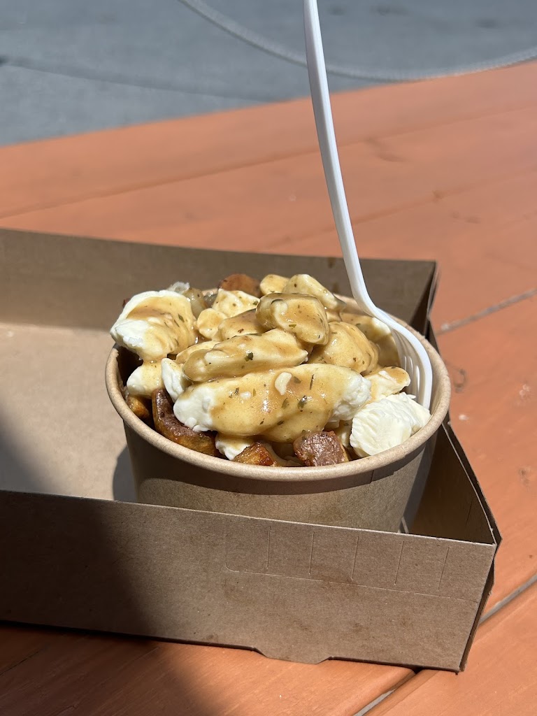 Excellent food truck. Some picnic tables but could use an umbrella. The routine is thick cut homemade fries and delicious gravy that seems homemade. Squeaky cheese curds, yum!