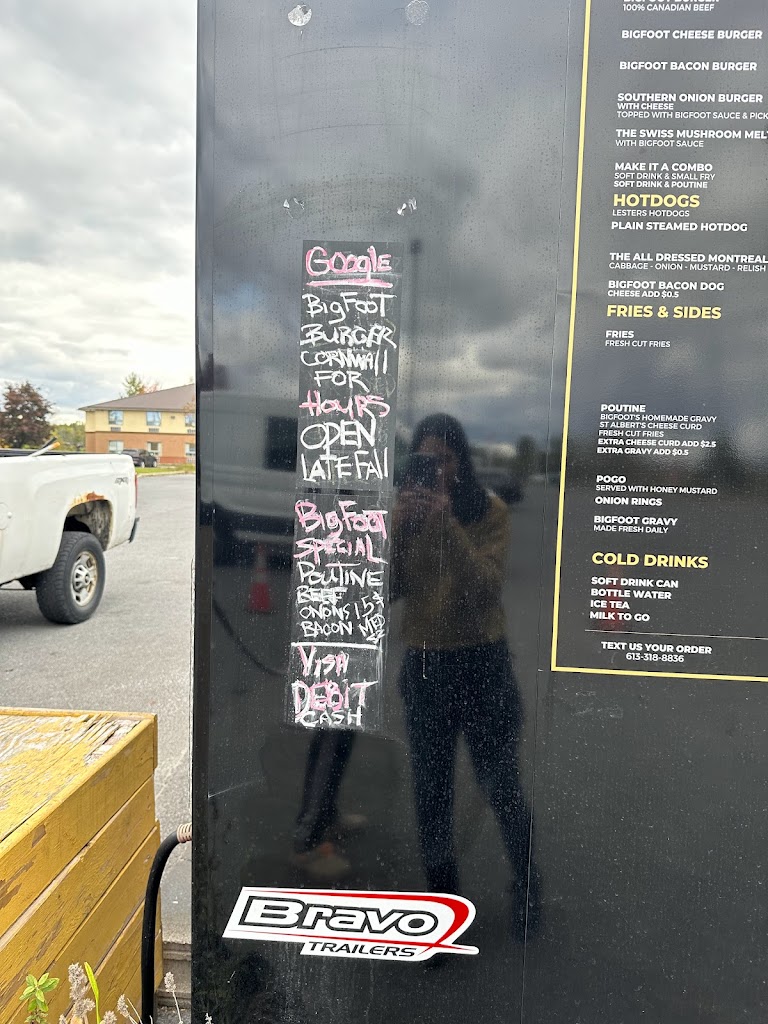 This summer we were driving back from Quebec and needed to stop at Seaway Chevrolet for emergency service work on our car after a collision with a deer. The folks at Seaway Chev recommended Bigfoot Burger, which is across the street from the GM dealership, so we walked over and had lunch. It was our first time having a smashburger so we followed the recommendations regarding what to order and how to have it dressed. All three of us loved our meals and I look forward to our next trip to Quebec so we can stop at Bigfoot Burger. Not only was the food delicious and well prepared, but the whole experience was unique and very enjoyable. The owner has a very dry sense of humour and had us laughing the whole time. Do yourself a favour and give Bigfoot Burger a try if you are on the 401 heading to or from Quebec.