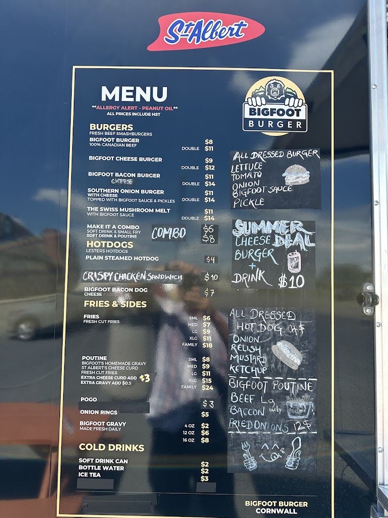 Text orders only from December to February. no calls please . Thank you. Bigfootburger uses only fresh alberta chuck to make the tastiest smashburger. Seasoned to perfection with our signature Bigfoot sauce and a grilled brioch bun. Our fries are fresh cut with bigfoot homemade gravy and St Albert’s cheese curds. We also sell lesters hot dogs. (Beef ,pork and chicken). Pogos. Onion rings. Crunchy chicken or bacon chicken club burgers. Poutine (classic) (New)Bigfoot poutine bacon,beef,onions. (New)bigfoot cheesesteak. sub. Small batch chilli for dogs or fries. Pop and diet pop Water Ice tea Mr brownie. Hot chocolat after 6pm.