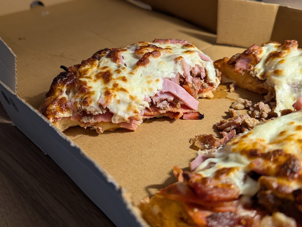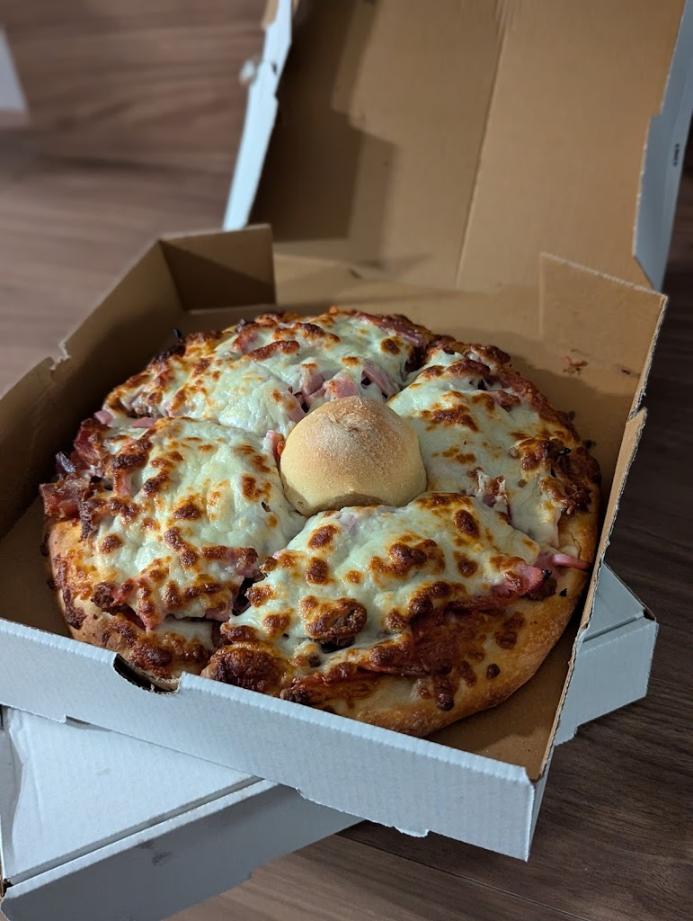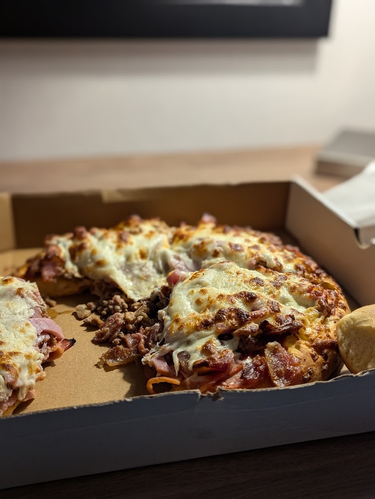 Fast delivery, free poutine is always a plus(sunday-wednesday with pizza). Pizza always has a lot of toppings. I love their garlic bread.