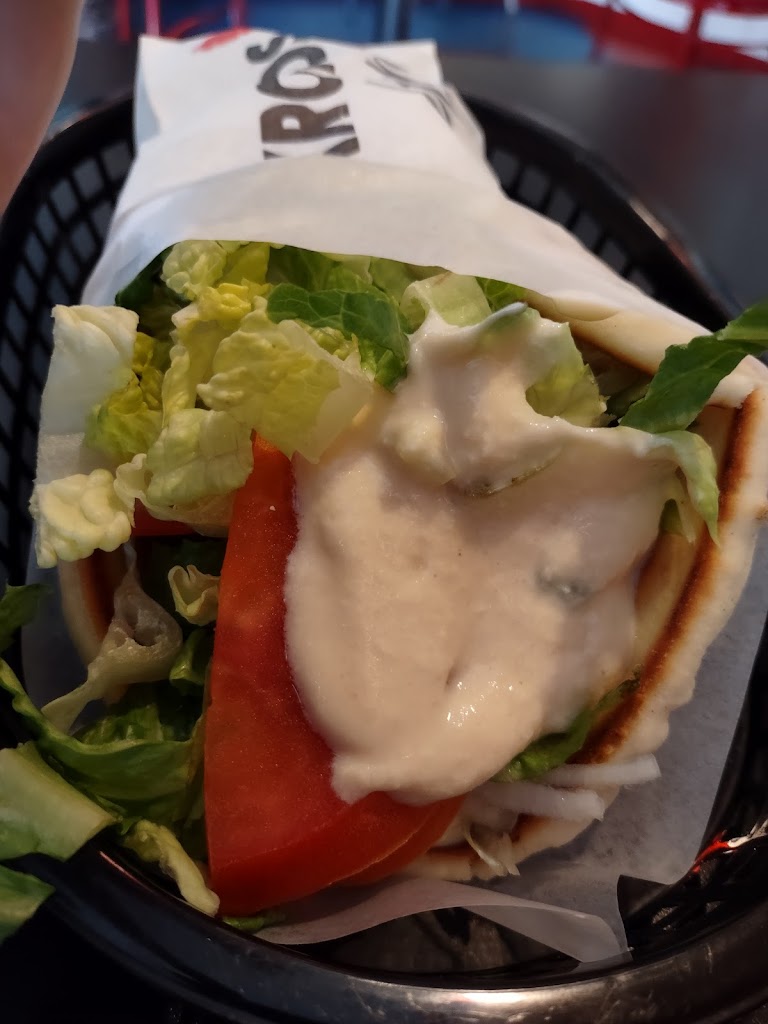 Eww, who makes gyros with boiled chicken. Pretty blend. Not sure how it is rated 4.3 Noted later that you can some more veggies; I would be glad to do that, and pay extra for it, but neither that wasn t mentioned on the menu board, nor told when ordering.