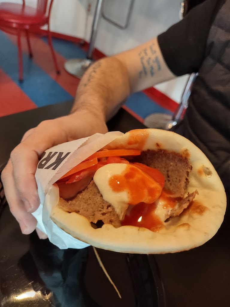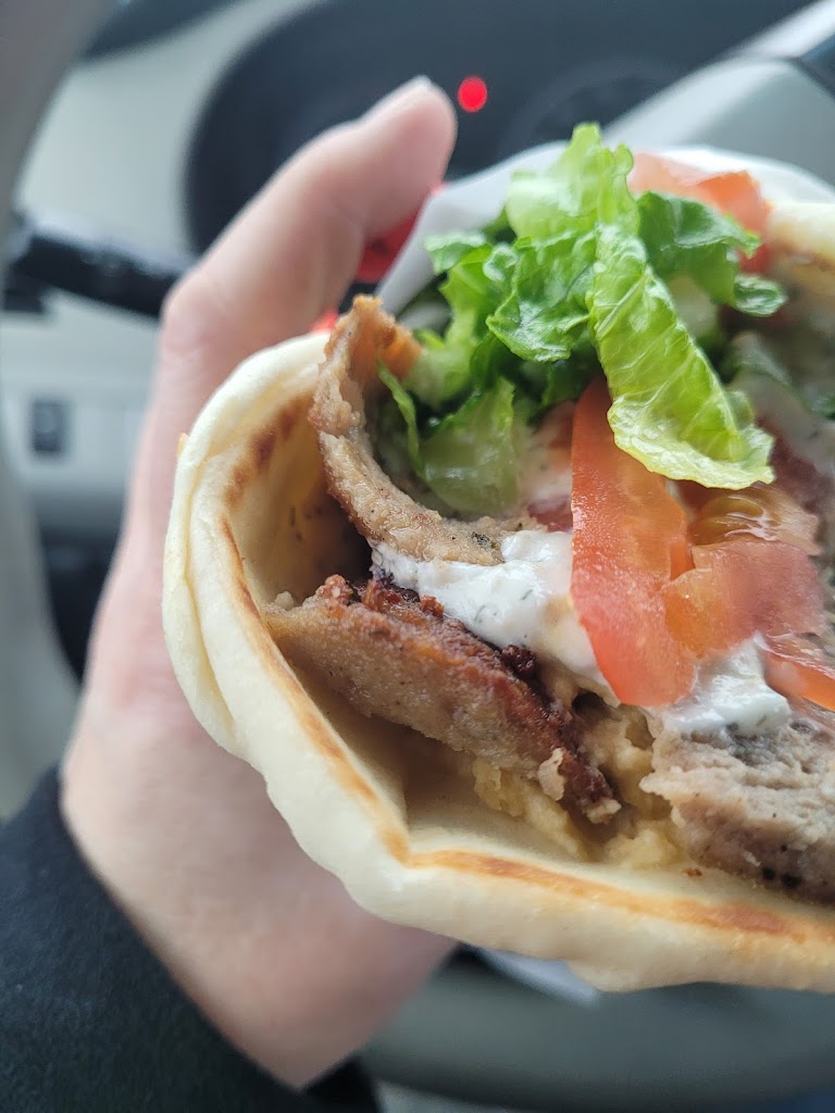 Meat is cooked authentic on a vertical spit, and a to-go window for those rushed days!! Beef & lamb gyro, add hot sauce and sweet sauce together and ooooooohhh myyyy goooodness. So convenient, good for your soul food.