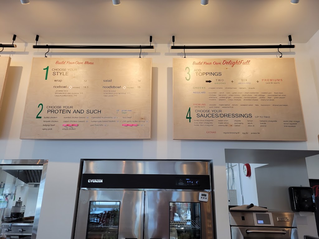 Thin veggies, low amount of protein, staff not well prepared for questions. Several Menu changes deleting items we had anticipated. Falafel was an aweful disintegrating dry mess. Little value for 40$ for 2. Sorry. Not delightful.