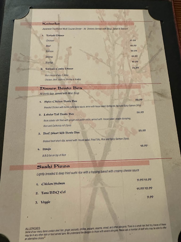 I had salmon teriyaki dinner. It s yummy. It comes with miso soup, salad, and ice cream dessert. The price was worth it.