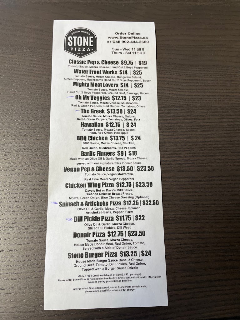 Honestly, Stone Pizza use to be one of our Go-to Pizza Places. Over the past year their food quality and portions went down, prices also dont balance the worth out. We ordered the Garlic Fingers (added bacon / banana peppers) and Water Works Pizza. The bread was dry and uncomfortable to chew. Both pizza toppings were lacking, and paying for extra toppings to barely have anything put on… Disappointing to say the least. Service was also bad which we never experienced before, we asked if the donair sauce was with the Garlic fingers, Woman working replied “I don’t know” and didn’t even bother to check because “she didn’t make it.” We ended up getting the sauce and it was extremely watered down, zero flavor. Really do hope this place begins to flourish, adapt and become what it once was. That said we will not be returning, sadly.