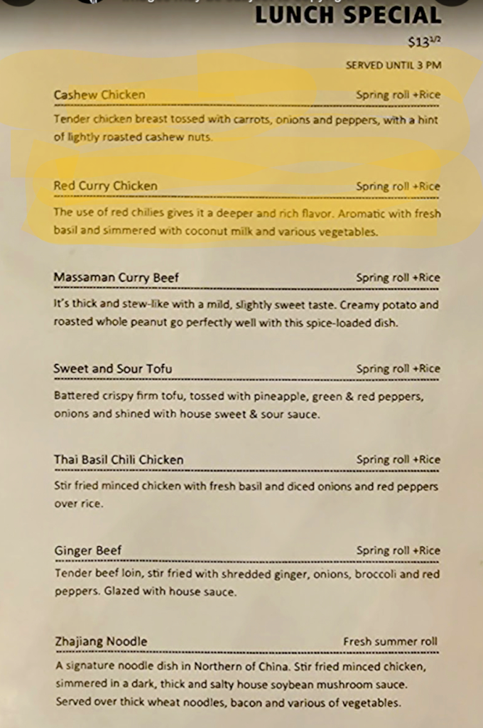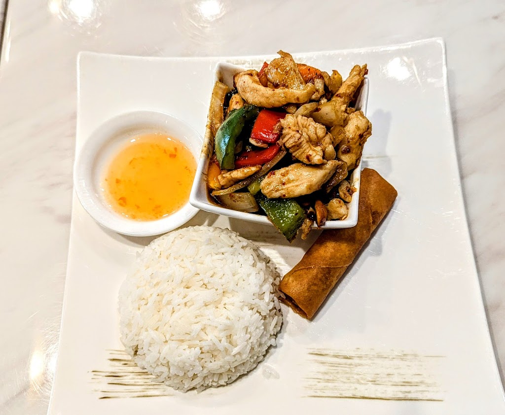 Delicious Thai food! This was our second trip. The lunch specials are very affordable at $13.50. 2nd trip: I got the Cashew Chicken and my mother got the Zhajiang Noodles, hold the bacon. For dessert we got the mango sticky rice and the caramelized profiteroles. Everything was good, though the noodles were a bit sweet (probably because we ordered without bacon). The summer rolls were particularly nice! 1st trip: We got the lunch special portion of massaman curry beef, a mango salad, and a wonton soup. Everything was delicious and the portions were generous but not overwhelming. The ambiance is nice and our server was very friendly and helpful.