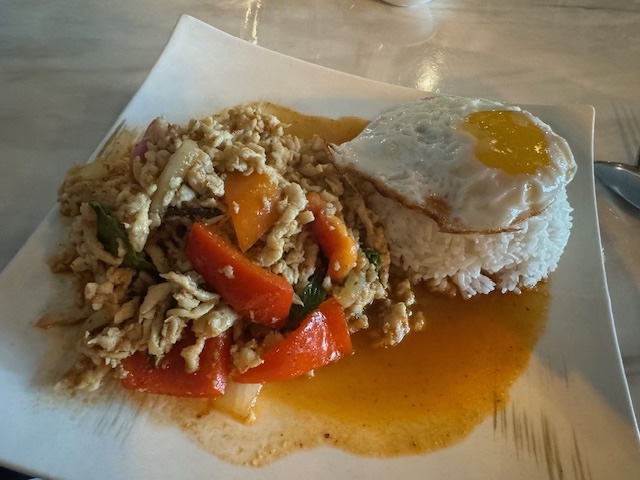 Lots of fresh veggies, really delicious fried rice and thai curry. Ill definitely be going there again.