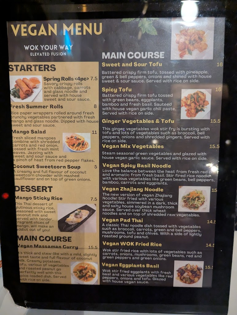 Absolutely Phenomenal! We found this gem of a restaurant via a random online recommendation and it did not disappoint! When you first arrive at the bland outlet mall exterior next to a grocery store, youre not expecting much. But once inside, the interior is both stylish and inviting. The epitome of casual elegance. Every detail is well thought out and nothing is skimped on - right down to beautiful cutlery! (who thinks twice about cutlery?? Wok Your Way does!) The food choices are expansive but not overwhelming. Im vegan but the rest of my party was not and there were plenty of choices to satisfy everyones palate. All of us had both an appetizer and entree and the food was fantastic! There was no greasiness or MSG saltiness. All the food tasted fresh and delicious. Every dish was a home run. Every. Single. Dish. Service was also amazing! Super friendly staff. Our only note was that the kitchen was a tad slow. But considering the amazing food that came out, the small extra wait was worth it! And to top it all off the prices are super reasonable! The two of us that shared a bill, we each had 2x alcoholic drinks, an appetizer and an entree and our combined bill was $82! After tax! Like wow. A truly wonderful dining experience from start to finish. Wok Your Way has just become our new favourite restaurant!!