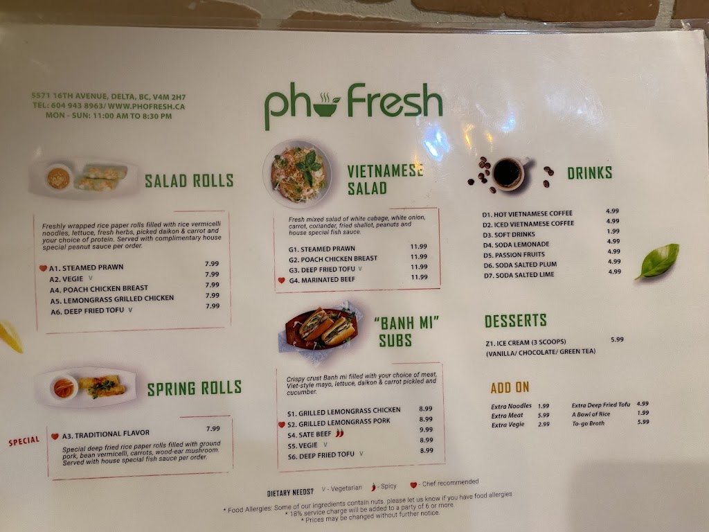 Stopped in for lunch before a mid-afternoon ferry back to Vancouver Island, and we were so glad we did. Weve eaten at many Vietnamese restaurants, and found Pho Fresh to be in the top tier, without a doubt. We shared a shrimp summer roll to start, which was beautifully rolled (this matters!) and held together while eaten. A bit heavy on cabbage, but delicious overall. My wife had chicken pho, which was generously portioned and quite delicious. My pork banh mi sandwich was large, piping hot and perfectly prepared -- the bun was toasty but not stale, and the pickled carrot and daikon was just right to balance out the pork. Only downer on the meal was a Vietnamese coffee pot that was dripping way too slow. By the time the water had passed through, the coffee was tepid. Still tasted good. Although the bathrooms are admittedly in need of serious attention (repairs, cleaning, and daily upkeep), the main restaurant is nicely updated and very clean. Service was exceptional from start to finish, and the prices are totally reasonable. Highly recommend!