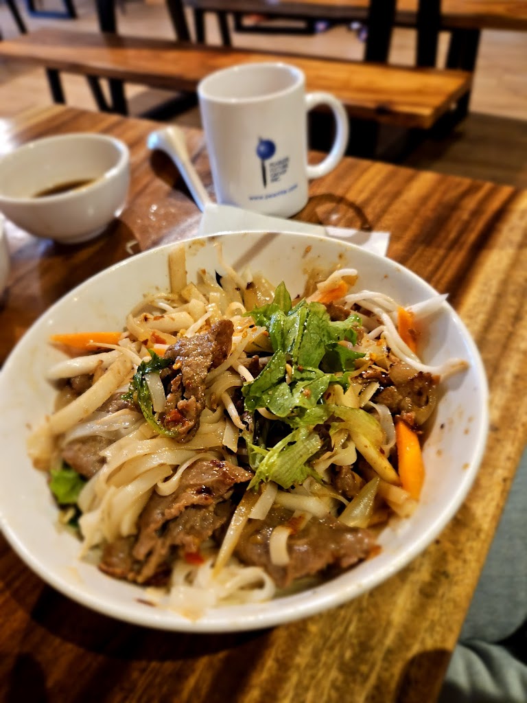 The pho satisfied the craving. It was flavourful, but I think there was a lot of msg in the broth. I was very thirsty after lunch. Aside from the small traces of broth on the noodles, I didnt drink the broth. My bf got a beef and pepper dish that turned out to be more like a Chinese stir fry using hot pot meat. It wasnt what he was expecting, and seemed expensive for the ingredients used. The Viet coffee isnt served with a coffee phin, but they are displayed at the front counter so Im guessing it was used in the kitchen. The space is beautiful and big, but it felt awkwardly quiet. I felt like I had to whisper so other diners dont listen to my conversation. Service was on the slower end, but staff are kind.