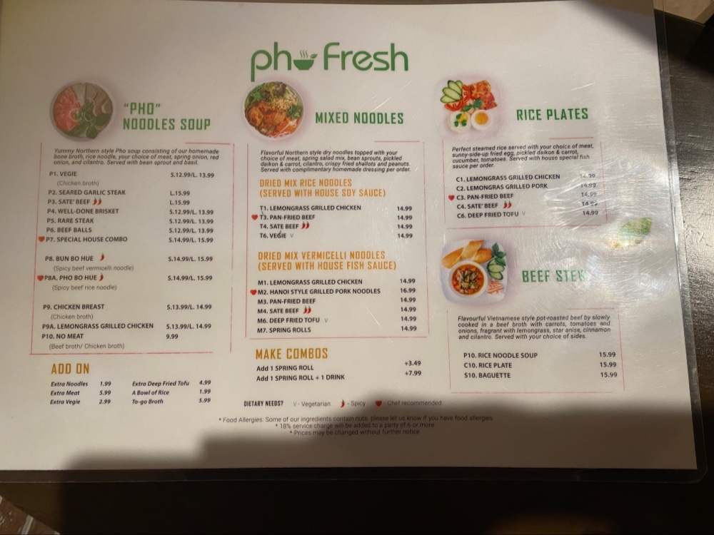 I ordered the M1. Lemongrass chicken vermicelli for lunch takeout in March 2024. Price after tax was $19.50. (For those of you who may be looking at old menu prices). Good: - restaurant interior seemed clean and airy while I waited -food portion was decent with a good sized spring roll included. A pleasant surprise compared to the tiny ones some other places offer. -the fried garlic garnishes were delicious Could be better: -the chicken had a weird mushy powdery texture not fresh. -it was titled lemongrass chicken but I could not taste the lemongrass at all. Would be better described just as grilled chicken. Overall, I may be willing to return and try other dishes but would avoid any lemongrass to avoid disappointment.