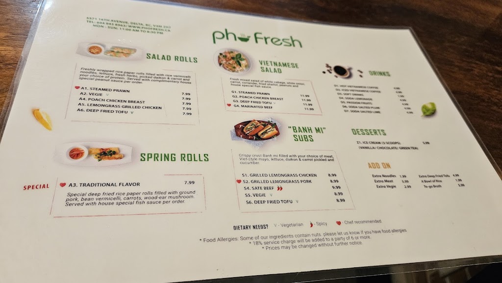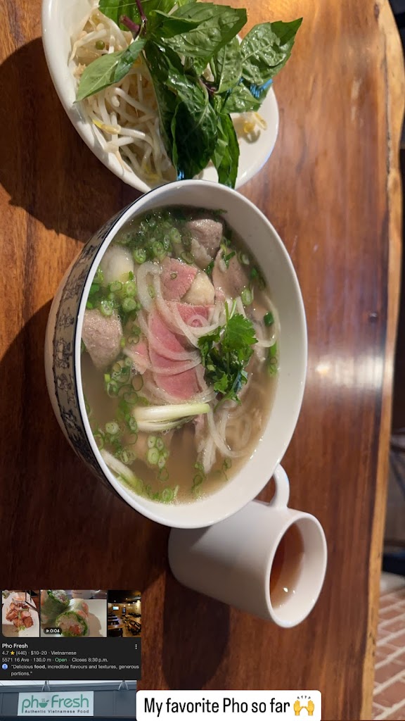 This Pho place in Delta is delicious! 5 Stars. Great service. Romantic Michael Buble music. Good Tea. Friendly people. Pho Fresh is so Fresh. we had the spicy beef noodle, and vermicelli noodles with spring rolls. Id recommend this Pho and Vietnamese restaurant to friends.