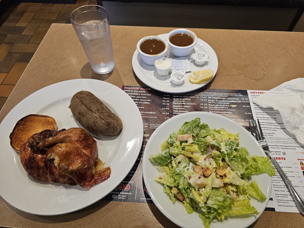 Juicy chicken and the fries are very tasty (fresh not frozen kind). Service was good too. Just wish they would have full course meal options: small soup or salad, main meal, mini dessert & fountain drink or coffee/tea for one price at supper time 7 days a week. *Going at lunch time during the week (as suggested by the owner) for a full course meal isnt possible when you are a family who works in the daytime and kids are in school.*