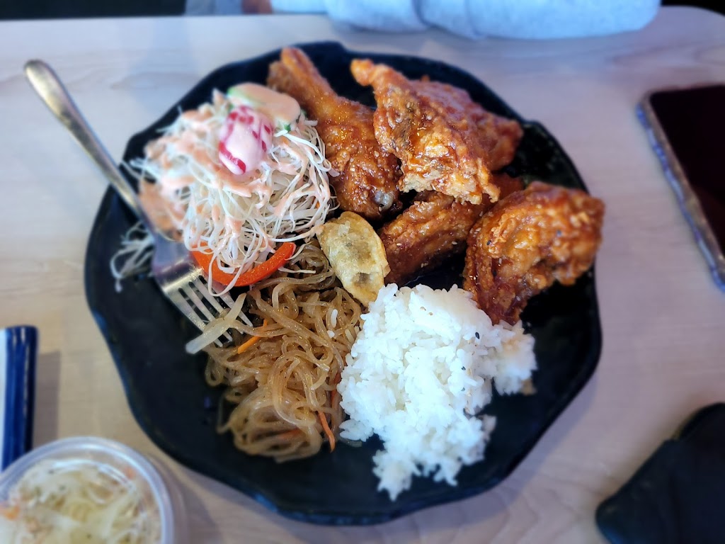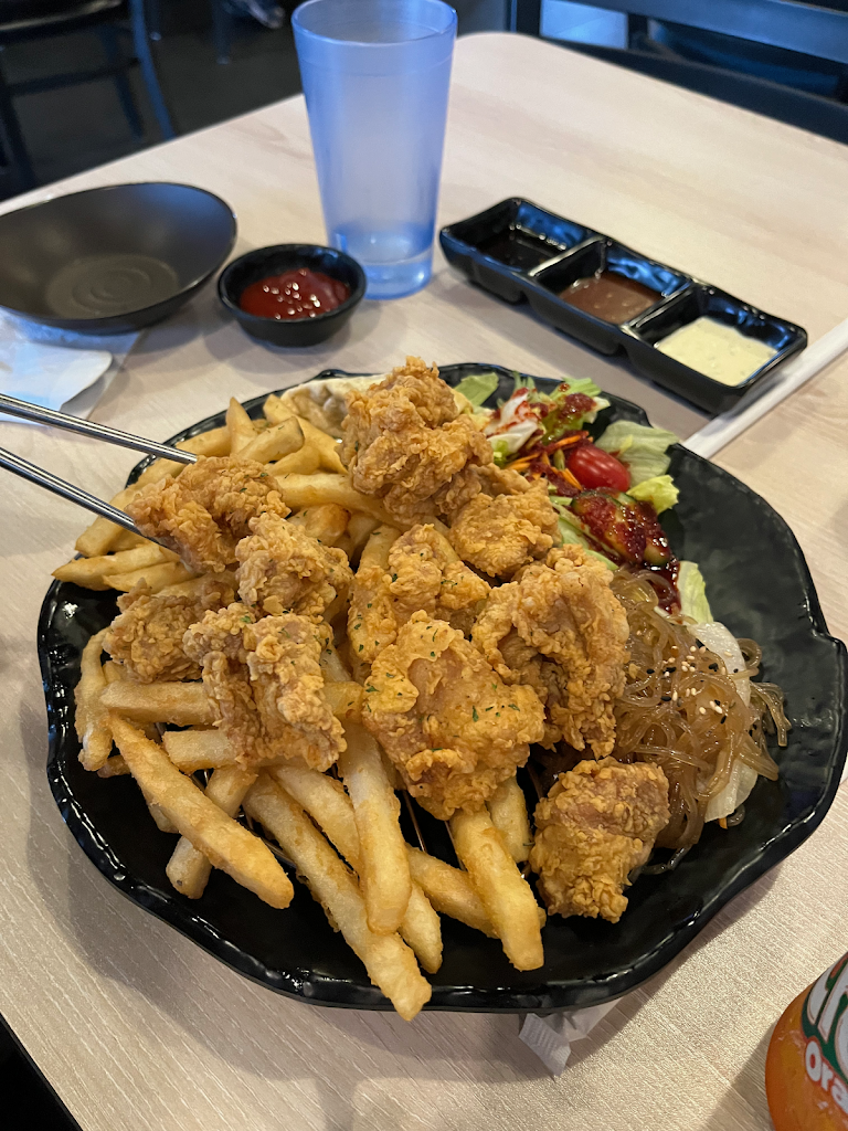 We had the breef bibimbap, boneless fried chicken, and japchae, bulgogi, salade, fries combo. The bibimbap was great. Flavor and textures really hit the spot. Bulgogi was good as well. The fried chicken was decent imo, and my kids devoured them. They have this short squat can of rice soda drink. Do not buy that thing. The other tall can (forgot the flavor) is much better, and worth trying. Fast service during lunch. I definitely recommend this place.