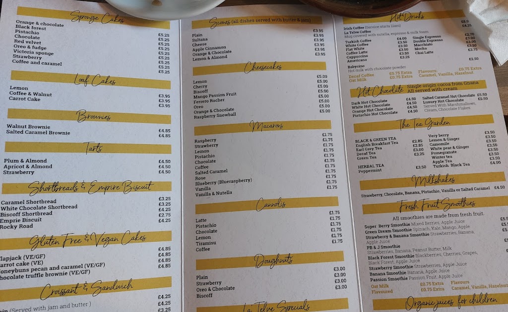 As someone who suffers severe nut allergies I felt very reassured by how careful and attentive the staff were Food was delicious and freshly prepared Cakes were tasty and everything was reasonably priced I would definitely recommend Food was delicious and fresh and was one of the best cafes I have ever been to la telve was nicely decorated and had nice and comfy seats.