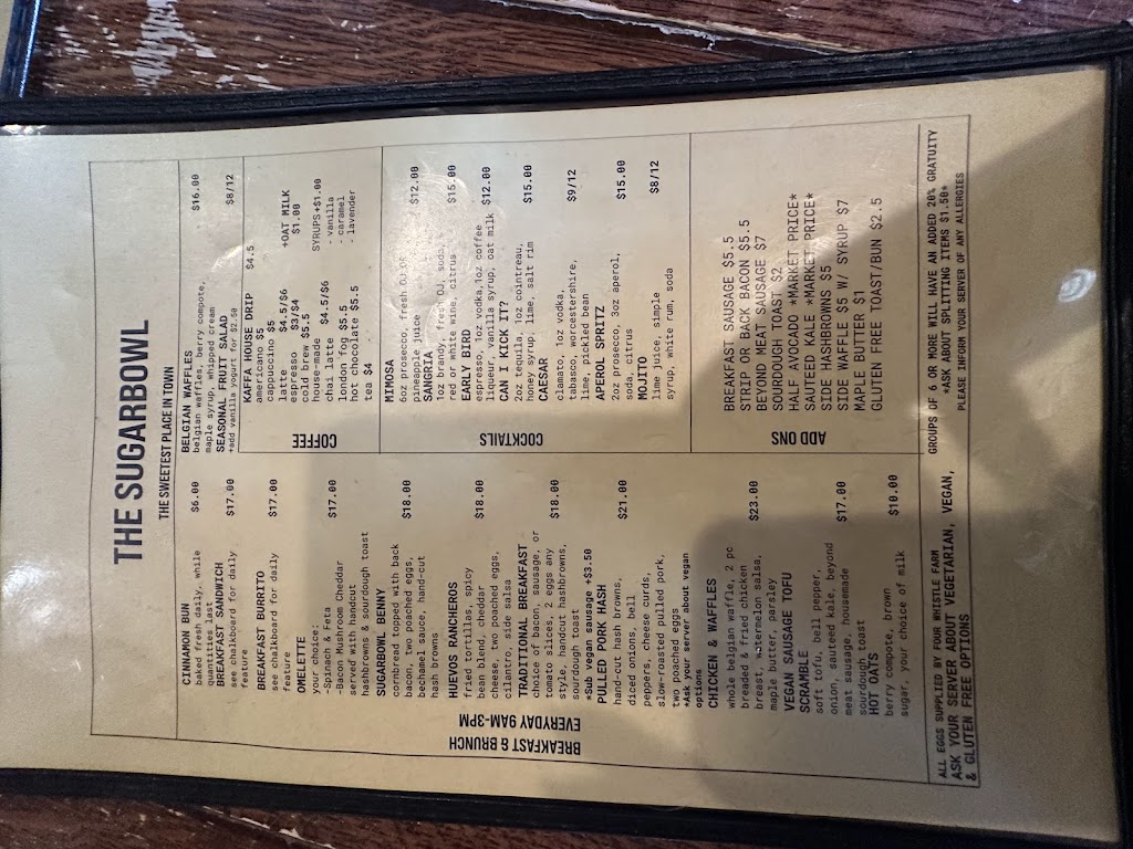 Love the Sugarbowl. Great brunch place with good coffee and adult drinks if youre in the mood. The menu isnt huge, but with changing specials theres always a reason to go back. And, you can pop in to Kaffa upstairs while you wait for a table, because its always busy.