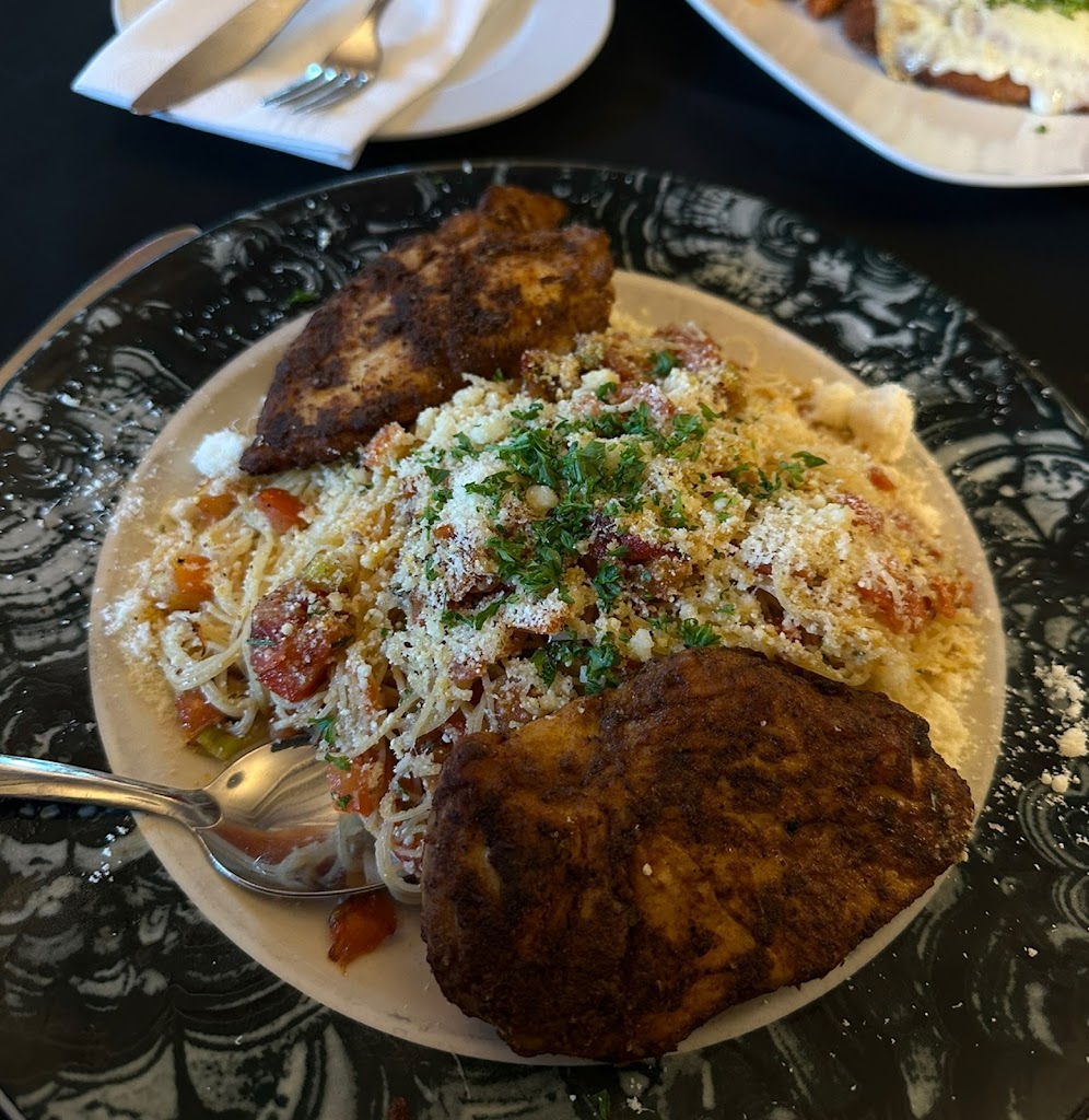 Angel hair Sergio - blackened chicken with spicy pasta, so Good.