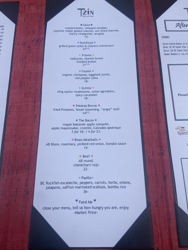 TZIN continues to shine, new tapas selection in the Feed Me option are outstanding (ie. Borscht Gnocchi). Excellent food, service, and hosting. And a nice selection of outstanding wines. If you want large portions of meat and potatoes this is not for you. If you want creative flavourful tapas style dishes with great service and recommended wine choices - there is no better place than this!