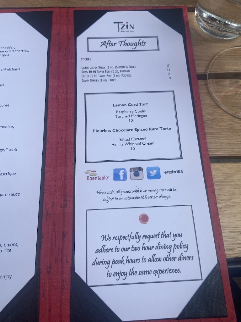 For my birthday, I was searching for a great restaurant and came across Tzin Wine and Tapas based on their excellent Google reviews. They did not disappoint! Although I forgot the names of the two waitresses who served us, they were incredibly kind and attentive. I don’t know much about wine, so I asked for a sweet one, and they chose perfectly. We ordered the famous "Feed Me" option, and everything was just delicious, check my photos!. My birthday cake was packed up to-go because I was so full! I highly recommend this place!