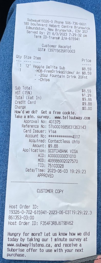 We stopped for lunch on Sunday around noon. All the staff had so much additude it was incredible. The disrespect we had was not welcomed by any means. It seems that because we asked for salads it became a big deal. The salads didn t get made properly and was thrown together like garbage. We ended up throwing the salads out and went on our way. We use subway for the salad options because of a special diet. I left very disappointed with our choice to stop at subway Edmundston on the hwy.