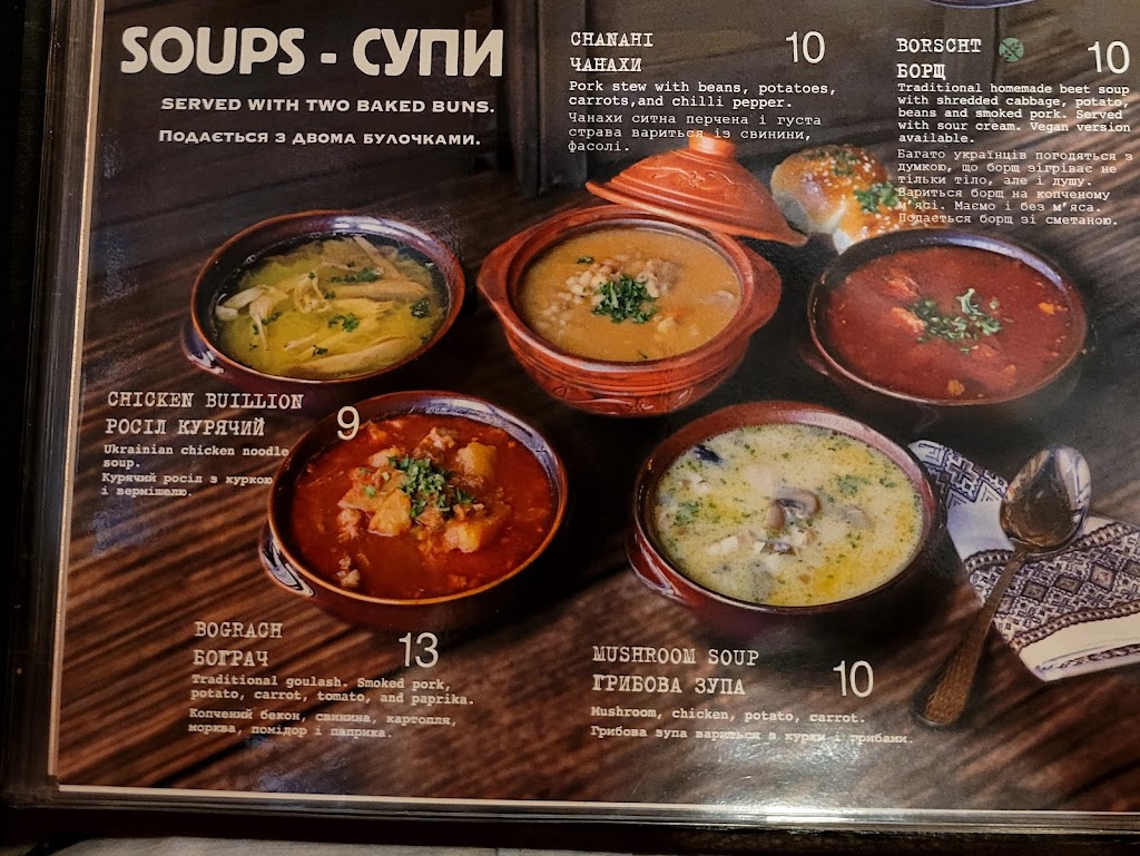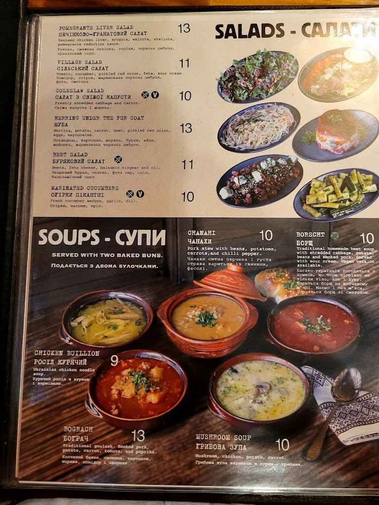 This place is great! Great food with great vives. The decor and aesthetic of the restaurant is really unique. And, of course, the food is really tasty and decently good value. This was one of my first times trying Ukrainian cuisine and I am happy I came here. I will be coming back in the future for sure. All the food in the picture fed two very hungry people (3 appetizers, 1 soup, 1 main), but this was a lot of food for sure and very filling!