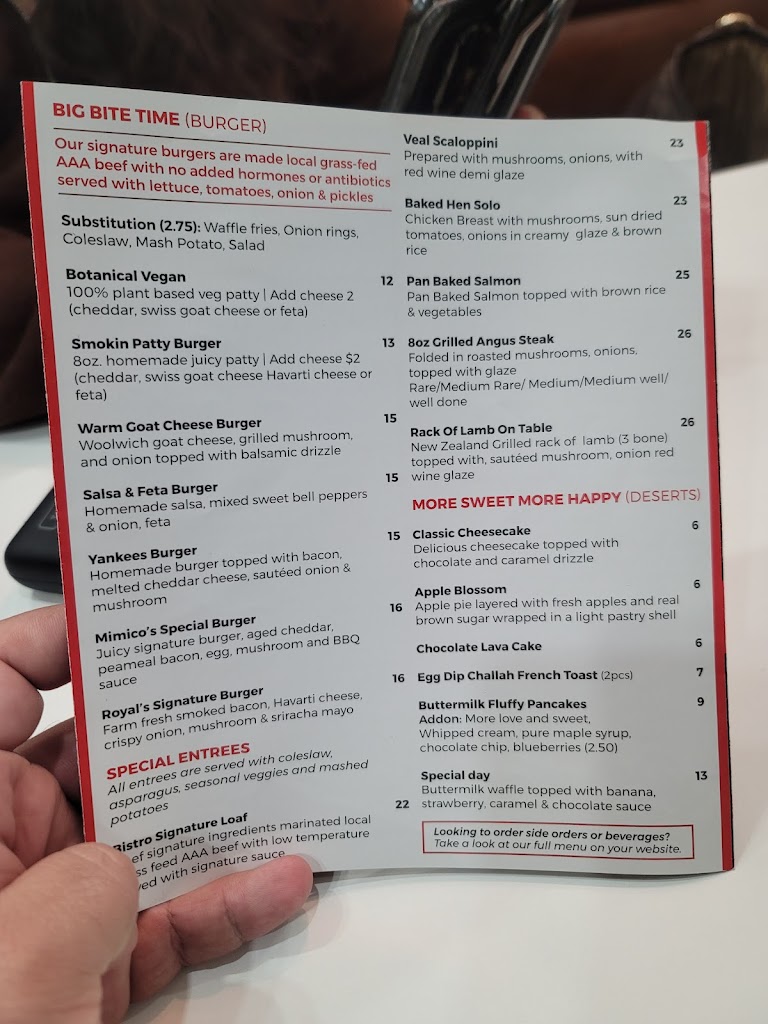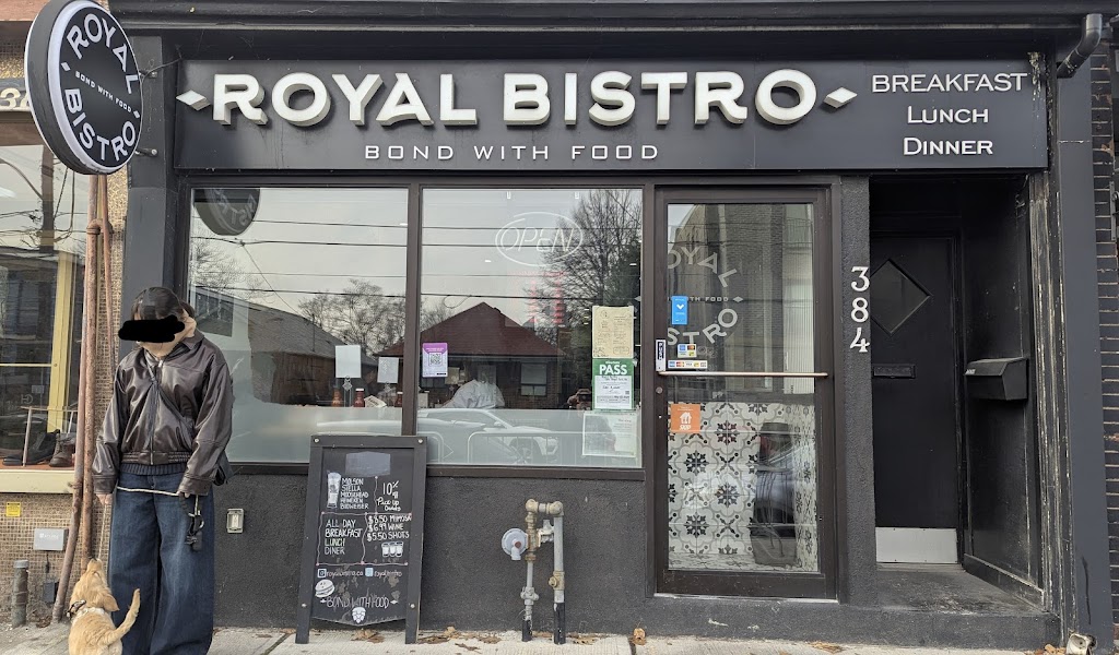 i visited Royal Bistro on saturday september 28 based on great reviews since we are from L.A ( USA) it didn t disappoint. A young girl , Saron . seated us quickly , with on a minute, and offered us a coffee right away. We had a nice chat with her , which made our visit even more enjoyable. We arrived around 10 am and ordered the steak and eggs, along with the salmon benedict . The food was amazing and really taste ! I recommend it to my family and friends in L.A next time they visit Toronto. Even though we were there for a short time and had to leave , we ordered takeout for my husband to try, and he loved it too. we will definitely be back when we return to Toronto! Parking: free parking in street