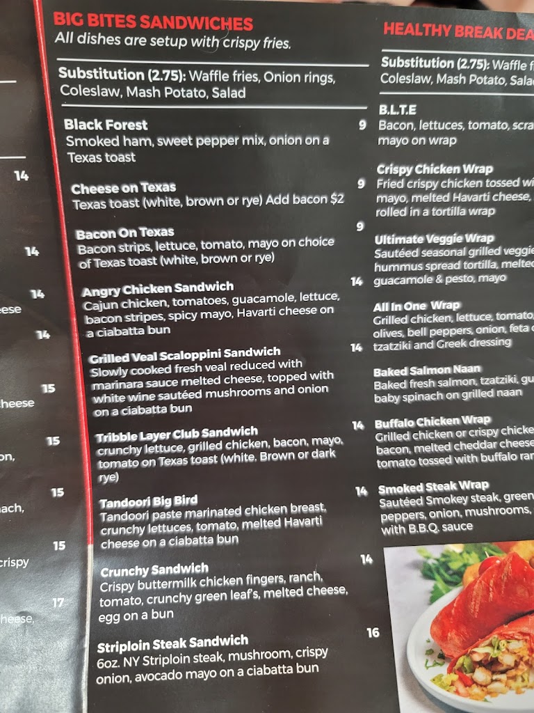 Got take out, the ribs & wings platter, homemade buttermilk chicken fingers & fries, angry chicken sandwich and greek salad. The food was beyond horrible. It's can't hard to mess up processed food. The crispy fries were ok but the chicken fingers were burned and salty. The chicken wings and ribs, typical processed salty slop but the worst was the greek salad. The bottom of the container contained brown and mostly wilted shredded iceberg lettuce. The top had some better looking lettuce, slimy cucumbers, bad tomatos, olives, feta and dressing were ok. The person who consumed about half the salad and half the chicken sandwich which was a 5/10 (the bread was fresh, lettuce and tomatoes old and soggy, the chicken very salty and processed) started having gastric issues within 2 hours of eating the food. The pictures show the bottom and top of the salad separated as well as the color of the chicken fingers. Otherwise it was quick and courteous service.