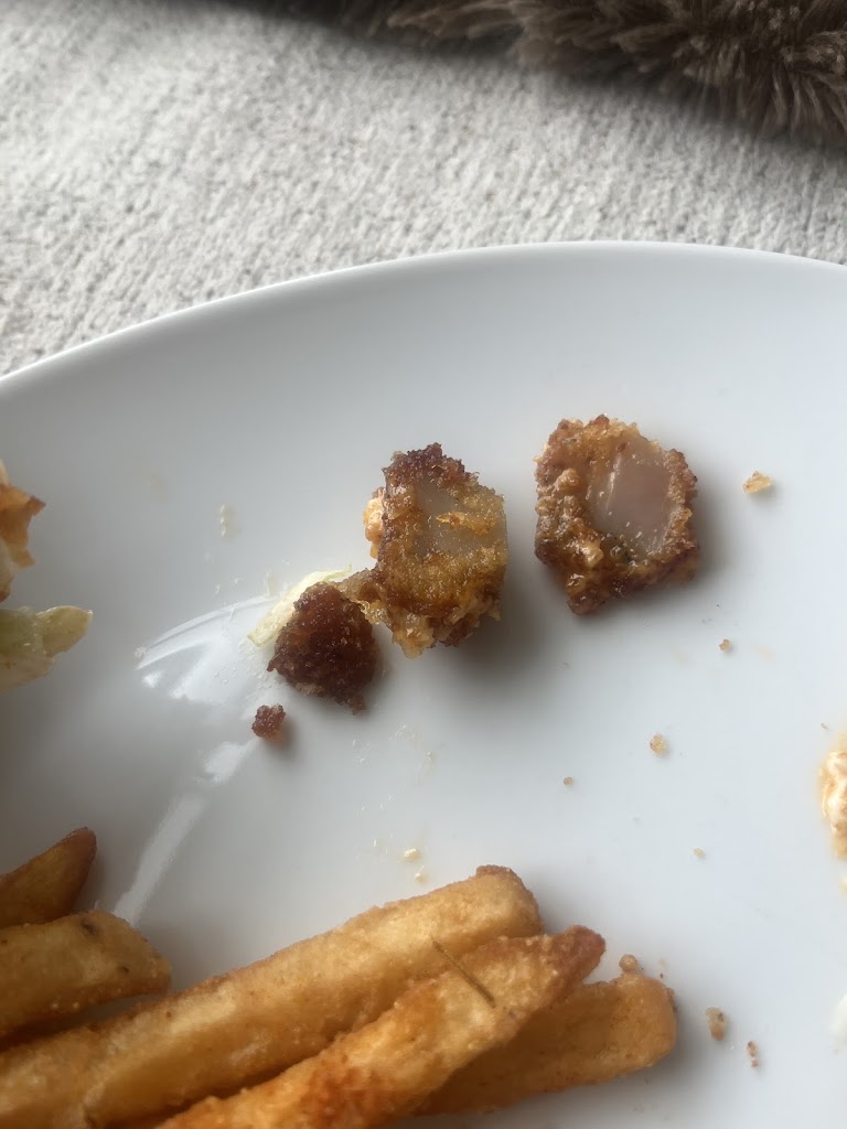 Ordered a crispy chicken wrap for take out with fries. The fries were delicious!! The wrap I have no idea what the ‘chicken’ was but it was so chewy, even you can see it’s like a clear gristle, maybe? Every piece was like this….