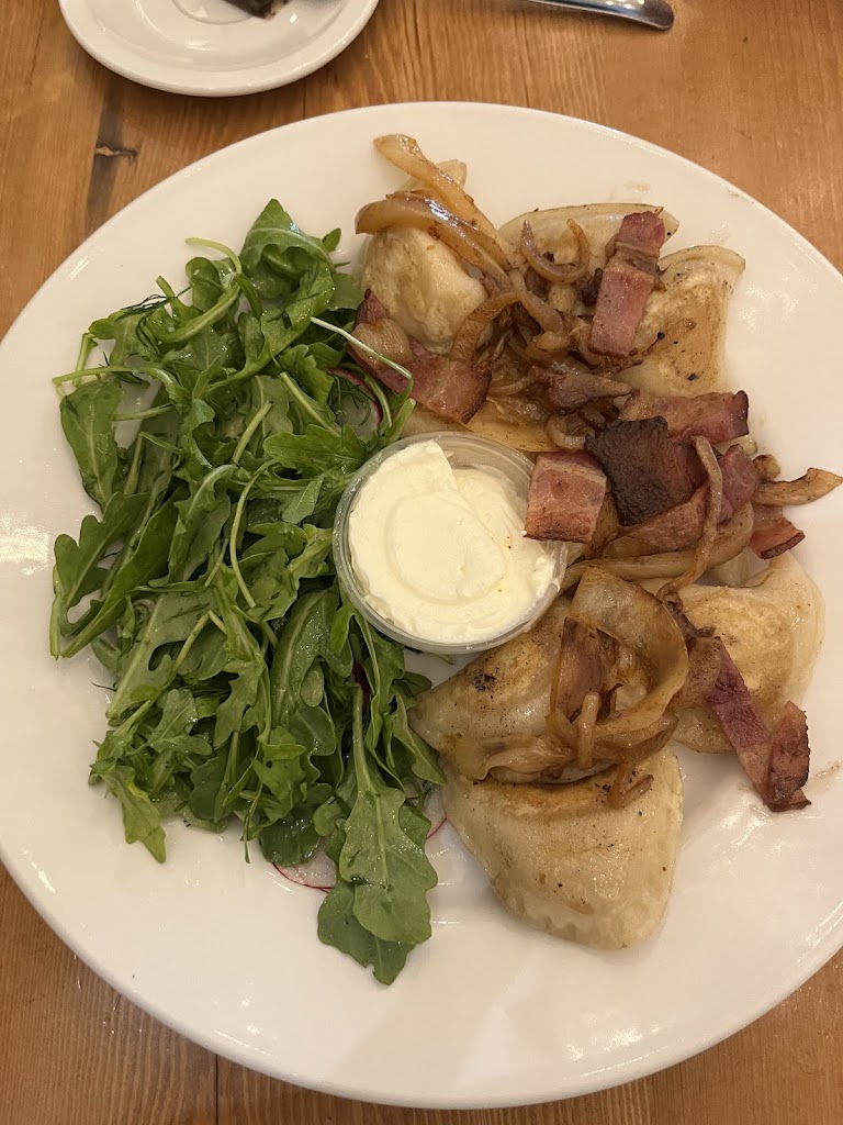 We visited just after the high time around 1pm on a Saturday. Beautiful place with good food and quite quickly prepared 👍 the portion was just right, not too much. And the ingredients were of a good quality also. Will definitely come back! We had a Full breakfast dish and pierogies with caramelized onions and bacon with salad on the side (tomatoes removed). Pierogies and onions tasted just like at home in Ukraine! 🥰