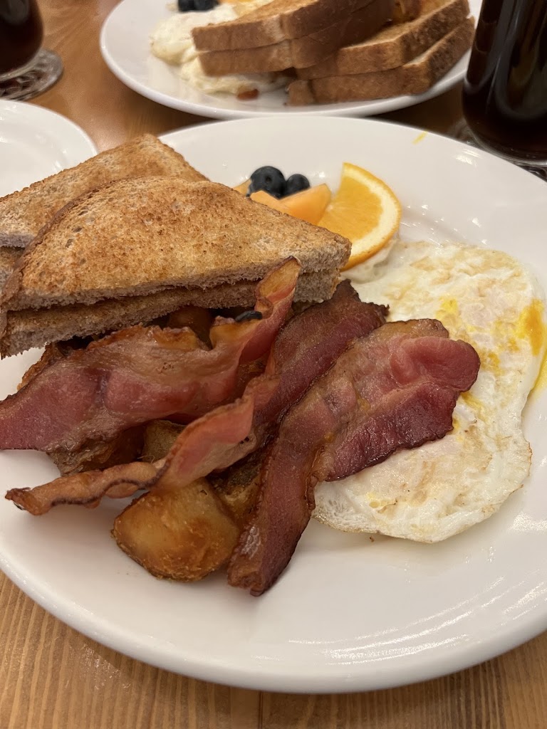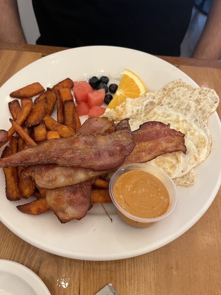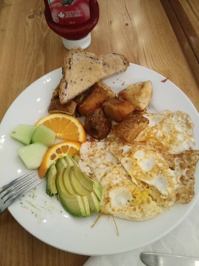My breakfast was good other than the fruit. I gladly paid $2-$3 to sub home fries for fruit and received 3 small pieces of honeydew melon and an orange slice so small it would go on top of a drink. More of a garnish than a serving of fruit. Definitely crazy to upcharge and get almost nothing in return. My partner got home fries and it was a generous portion. Would NOT reccomend swapping