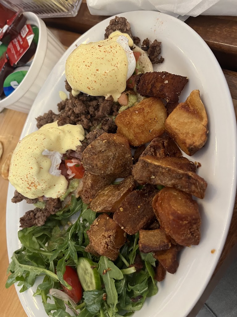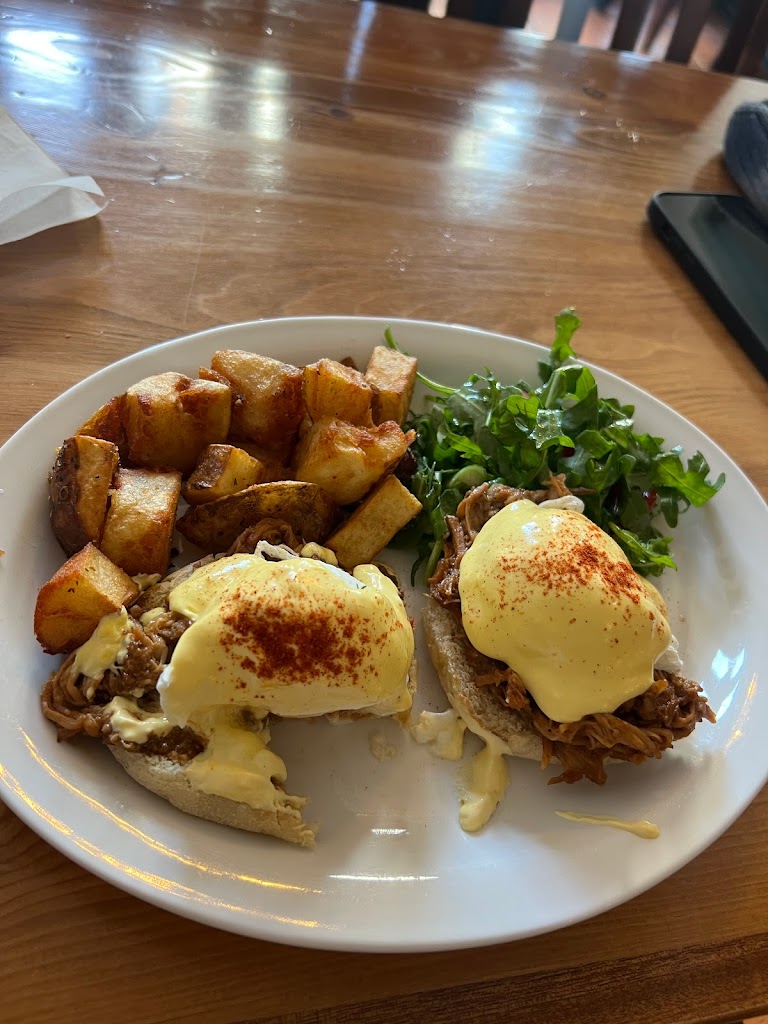 First time going because I noticed they serve all day breakfast and we ll be back. The eggs benedict were done exactly as I requested and tasted delicious. My partner had the roast beef sandwich and it was also delicious. Green P parking is only a short walk away. Vegetarian options: They have many veggie options, including burgers and jack fruit tacos. I had the eggs bennie with fresh avocado.